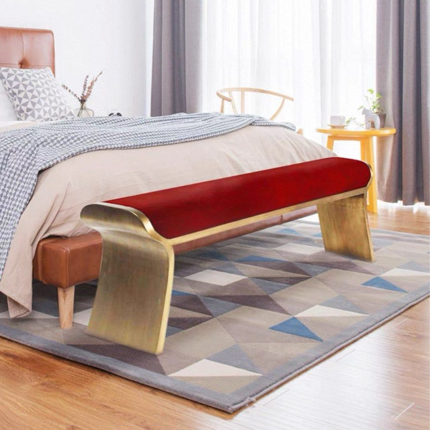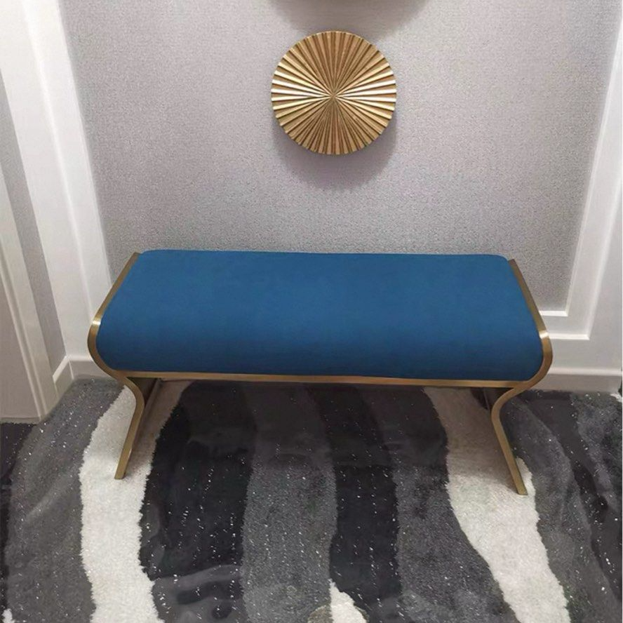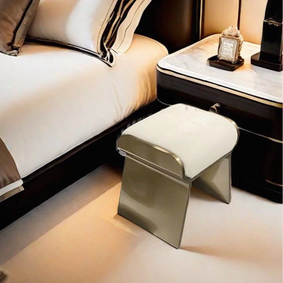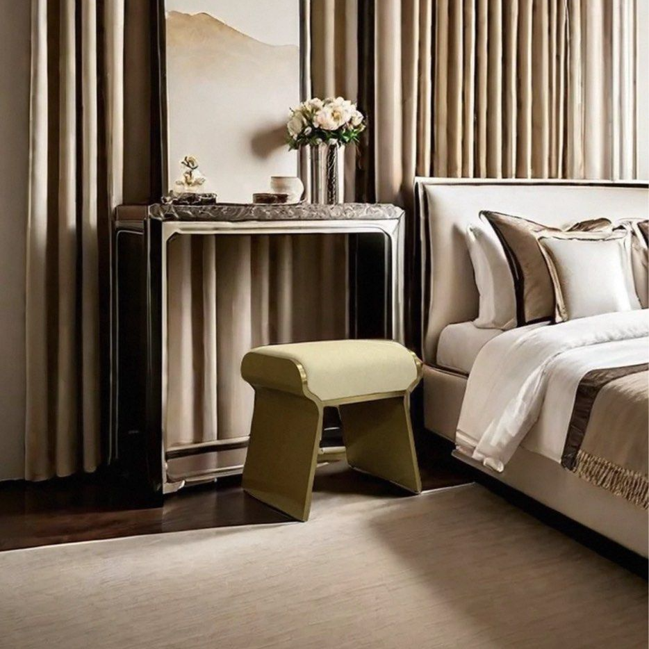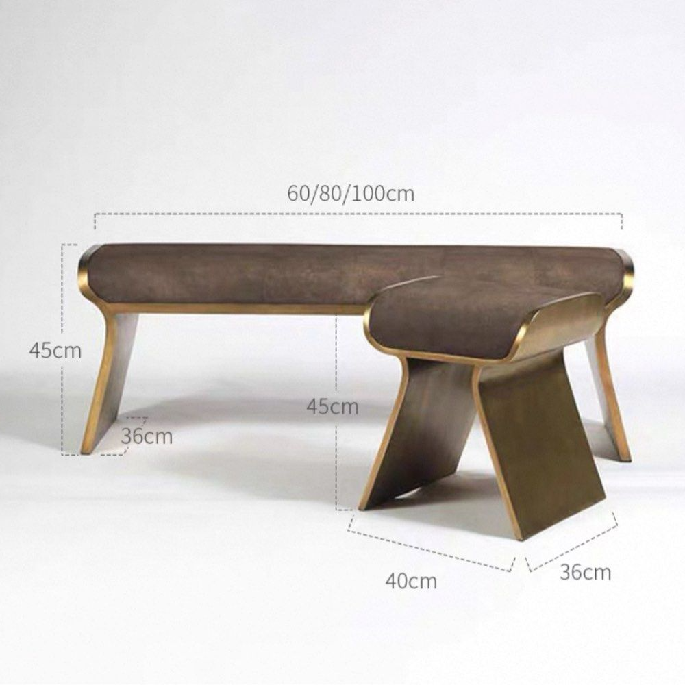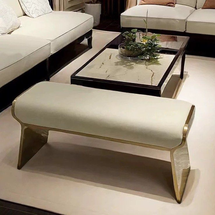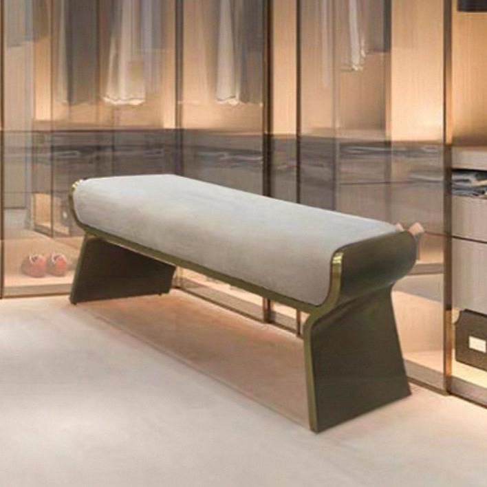 DREA Modern Luxury Ottoman Bench embodies modern luxury with its sleek, sculptural silhouette. It features a softly upholstered seat in a light, neutral fabric, offering both comfort and refined style. The frame showcases a striking brushed brass finish, adding a sophisticated metallic accent and a touch of warmth. The unique, angled legs create a dynamic visual profile, while maintaining a clean, minimalist aesthetic. Perfect for a walk-in closet, bedroom, or stylish entryway, this bench is both a functional seating option and a chic statement piece.