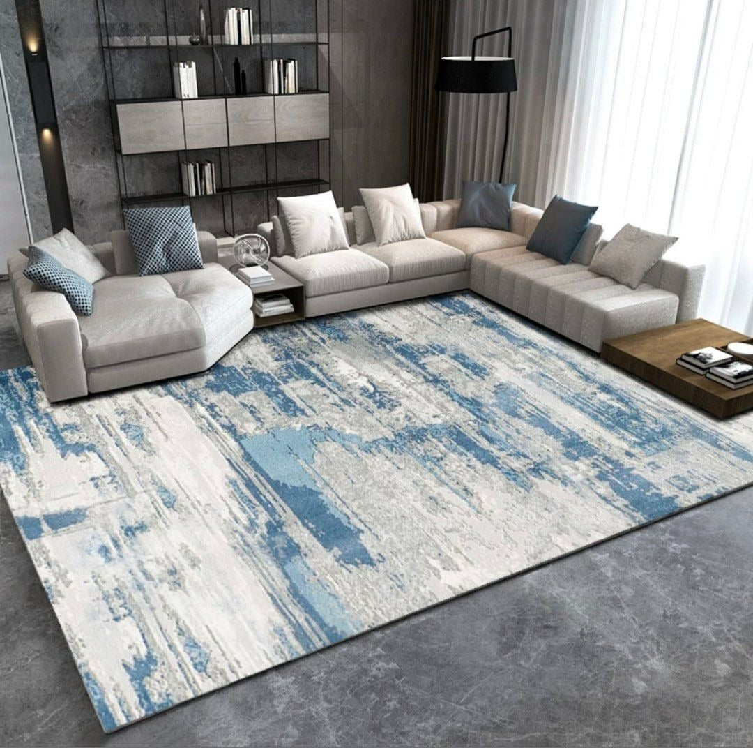 An abstract rug with blue and white tones has a modern design featuring a mix of blue and white colors arranged in a non-representational pattern. The design might feature geometric shapes, lines, or organic forms in varying shades of blue and white. This type of rug is often used to add a pop of color and interest to a room, and can complement both contemporary and traditional decor styles.