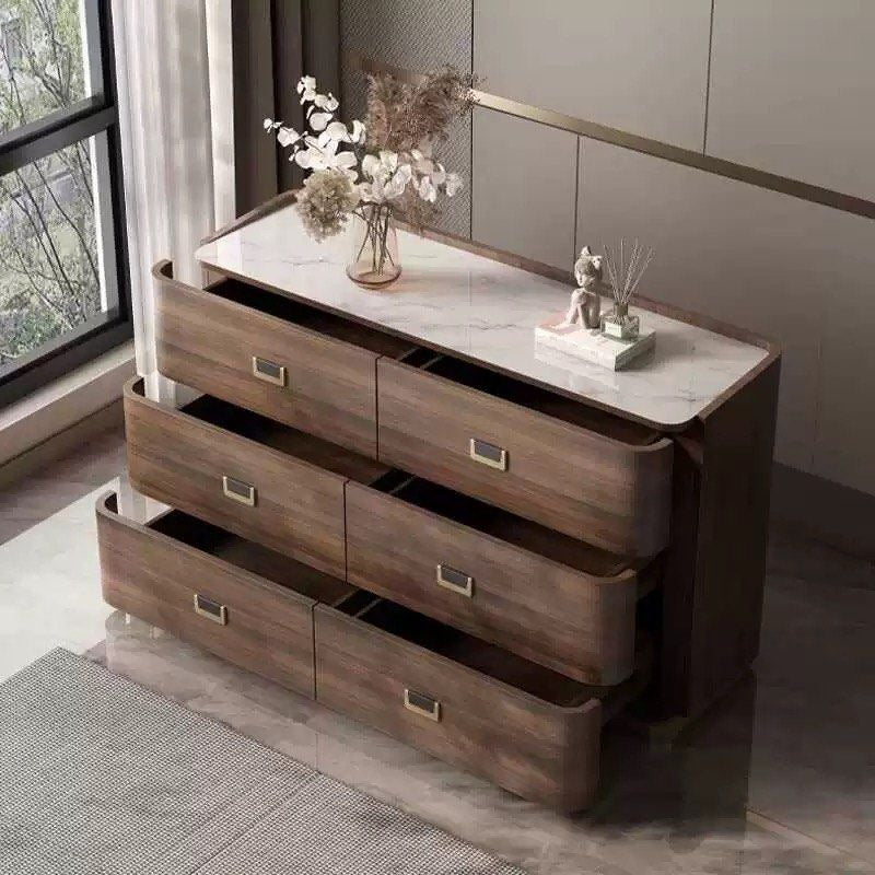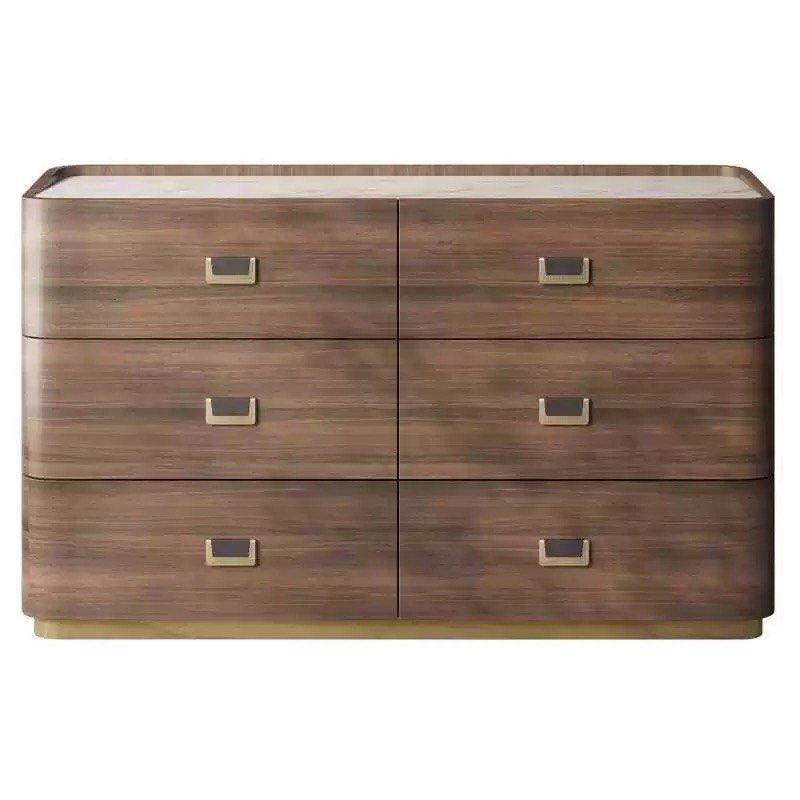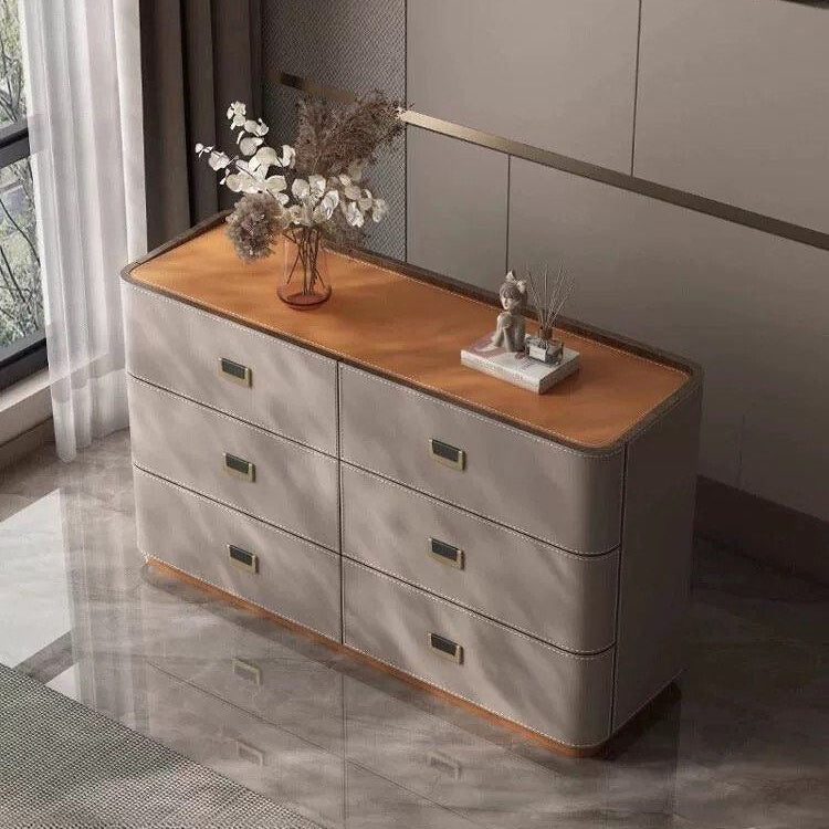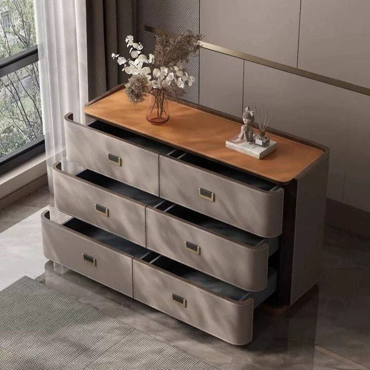 The AGRIPPA Modern Chest of Drawers redefines versatility with its dual material expressions. In its walnut finish, the multilayer board with wood veneer is paired with a durable sintered stone top, creating a sleek, earthy elegance supported by a powder-coated iron frame. Meanwhile, the orange and khaki variations offer a bold contemporary twist, featuring saddle leather cladding that exudes soft sophistication. The powder-coated iron frame ties both styles together with structural finesse, while spacious drawers ensure functional charm. AGRIPPA is a testament to the beauty of contrast, elevating storage into a statement of modern artistry.