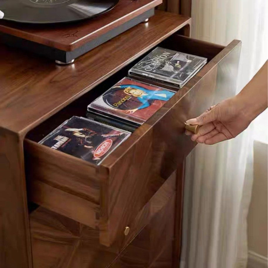 The FELIXINA Walnut Wood Chest Of Drawers is a statement piece that combines the rich beauty of walnut wood with modern design elements. This chest features a sleek, minimalist silhouette with clean lines and a smooth finish, showcasing the natural grain and warm tones of the walnut wood. Its elegant design makes it a perfect fit for contemporary interiors.