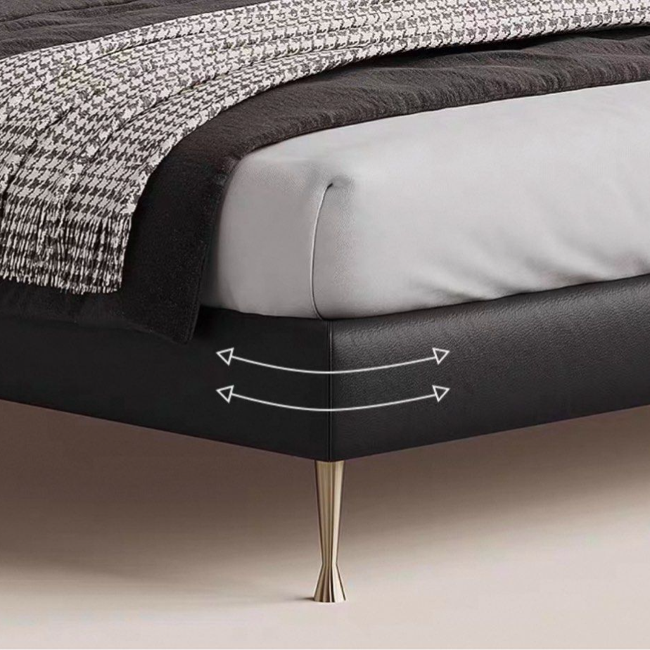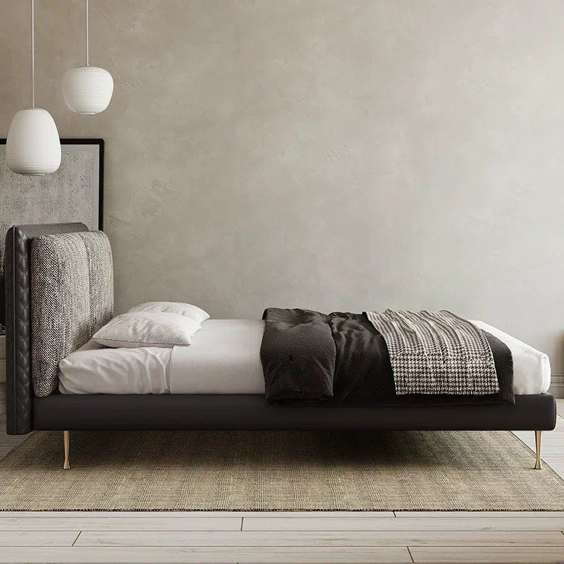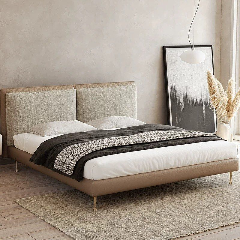 The HOSRER Modern Leather & Cotton Linen Bedframe is a stylish and contemporary bed frame designed to elevate the aesthetics of any bedroom. It features a sleek combination of premium leather upholstery and breathable cotton linen fabric, offering both luxury and comfort.