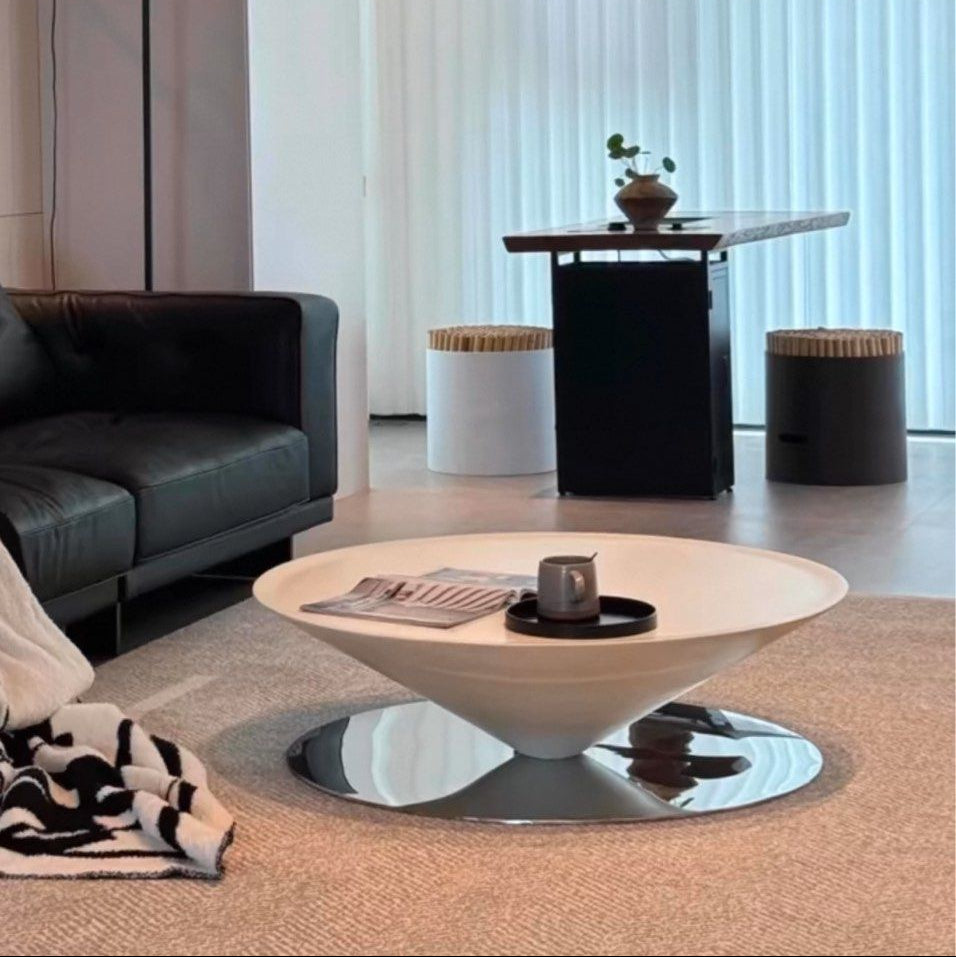 The KESSILO Modern Round Coffee Table features a sleek and contemporary design, perfect for any modern living space. It has a circular tabletop made from high quality fibreglass , paired with elegant and minimalistic stainless steel legs that provide a stable yet stylish base. Its clean lines and neutral color palette make it versatile, easily blending into various interior décor styles.