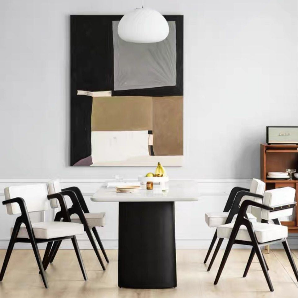 The EILIDH Modern Dining Table captivates with its distinctive design, featuring a striking black and white pattern on its tabletop. The juxtaposition of these contrasting tones adds a dynamic and contemporary flair to the dining space. Crafted with meticulous attention to detail, the table seamlessly combines style and durability