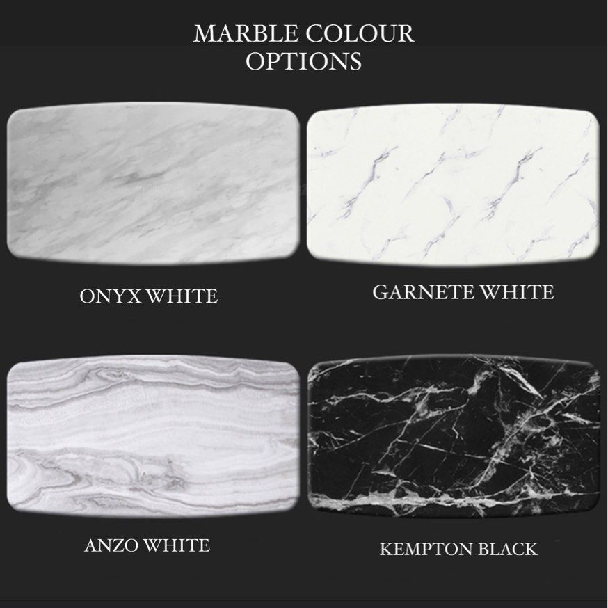 Onyx white / Garnete white / Anzo white / Kempton black / Wood slab