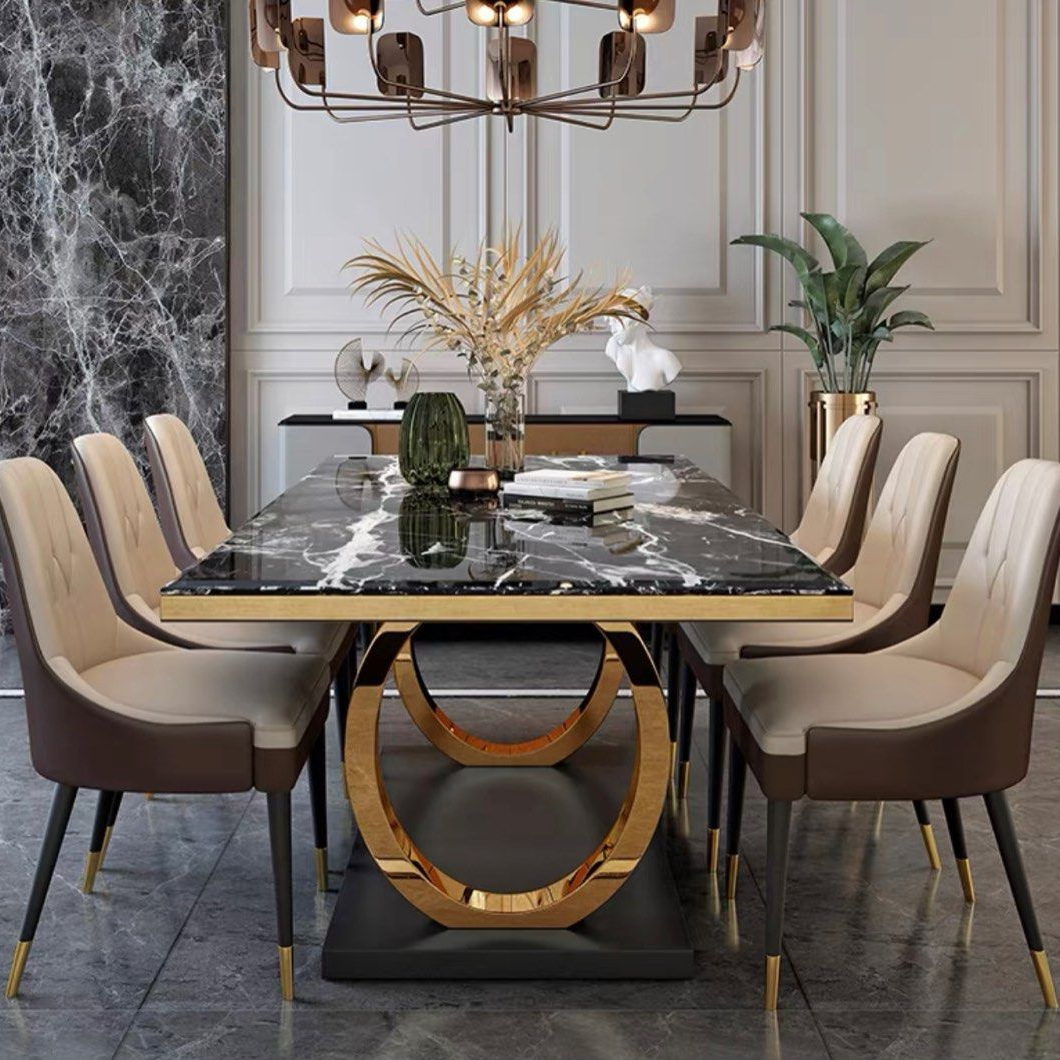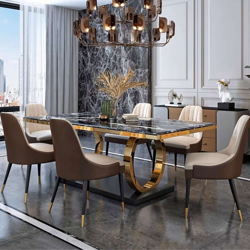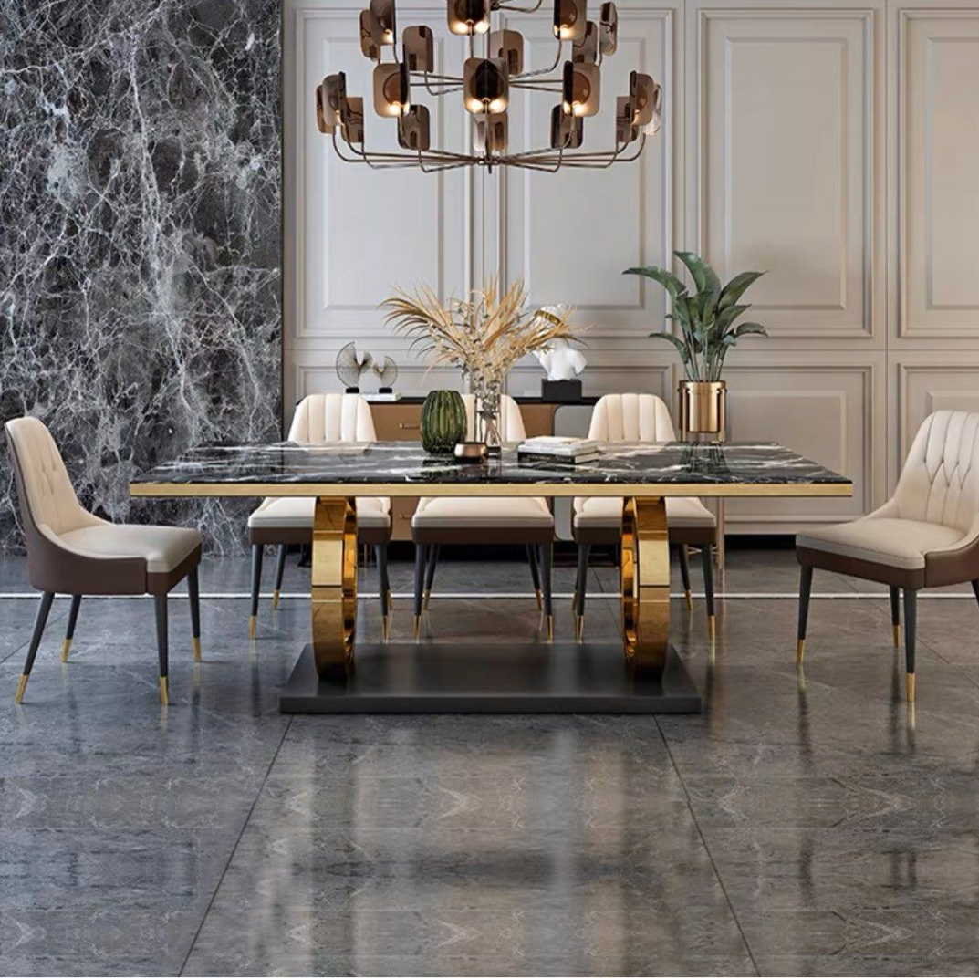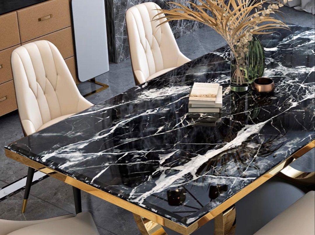 Upgrade your dining experience with our Modern Marble Dining Table, available in sophisticated Black and pristine White variations. The table is crafted from luxurious marble, adorned with sleek steel legs for a perfect balance of elegance and durability. Whether placed in a modern kitchen or a chic dining room, this table becomes a stunning centerpiece that combines style and functionality. Elevate your dining area with the quality craftsmanship and timeless appeal of our Modern Marble Dining Table.