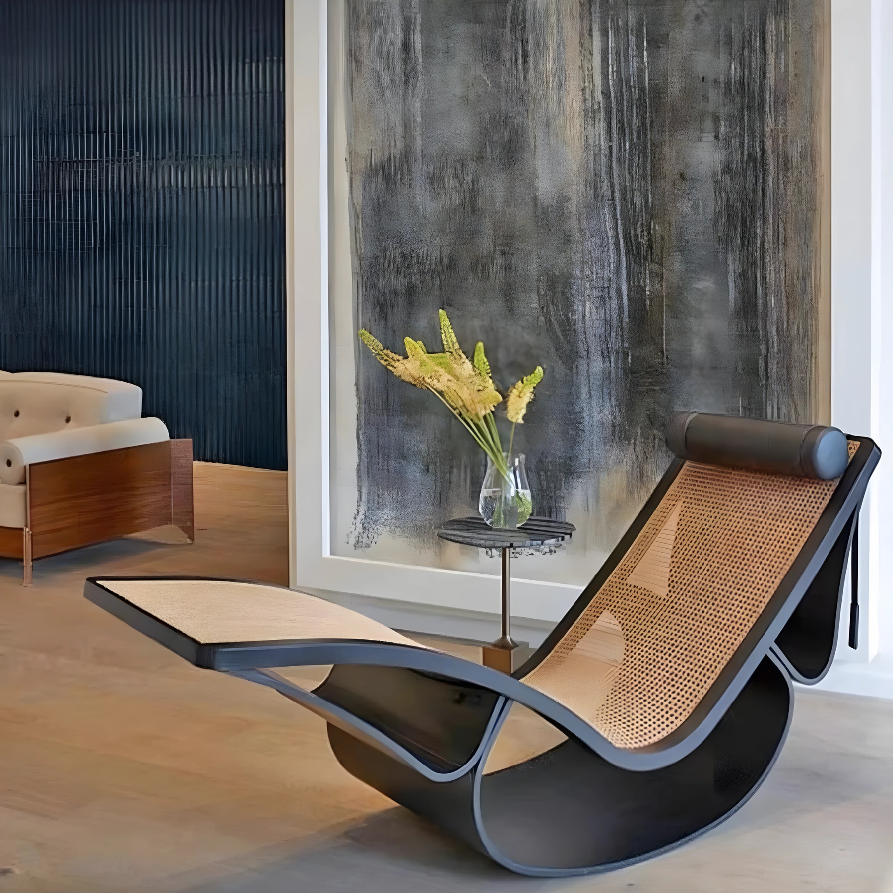 Description : Experience ultimate relaxation with the SERENO rocking lounge chair. The woven rattan backrest and seat allow excellent airflow, keeping you cool and comfortable. Supported by a sturdy aluminium alloy frame in matte black, this chair offers both durability and sleek modern aesthetics. Inspired by Wabi Sabi and Brutalist design, it celebrates the beauty of imperfection and raw simplicity. Perfect for indoor or outdoor spaces, the SERENO is a haven for rest, reflection, and effortless style.