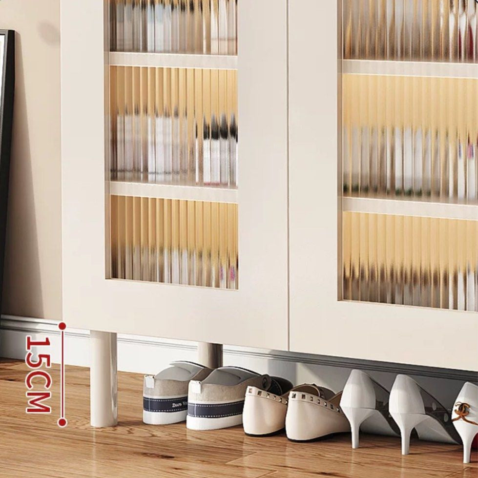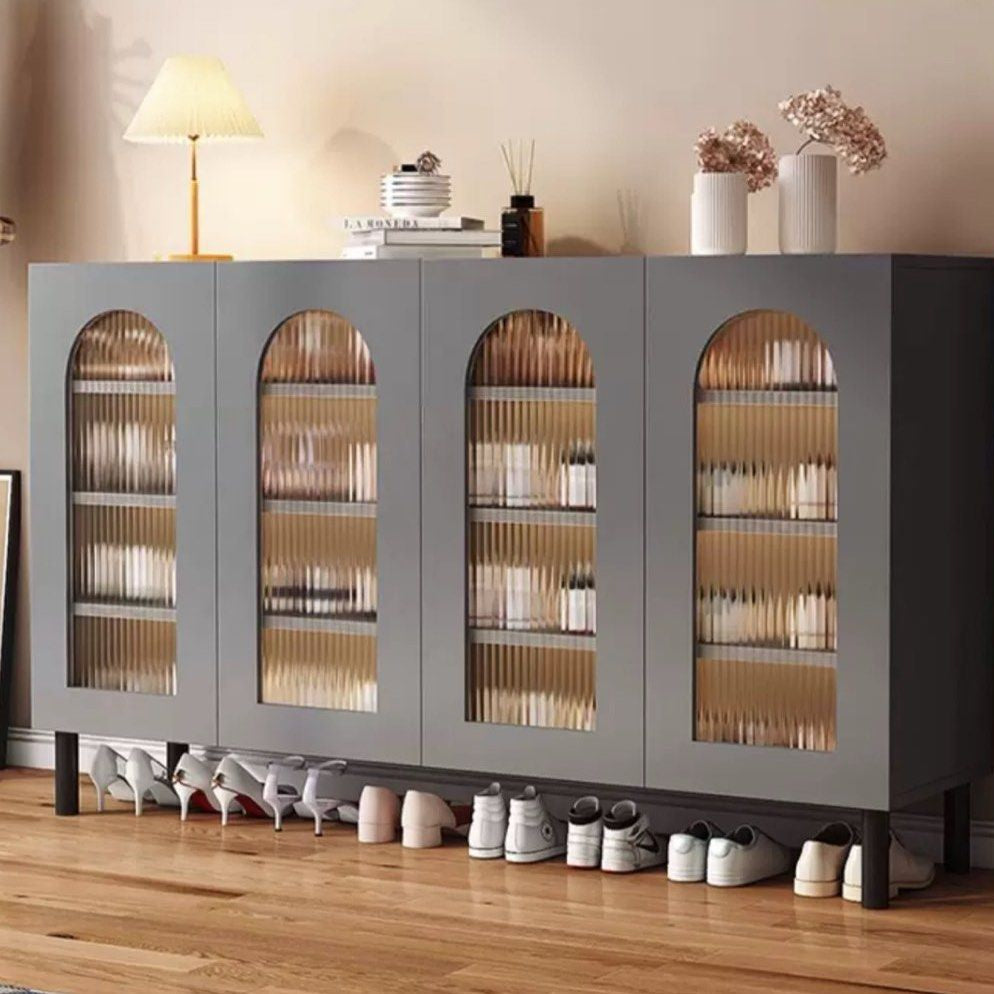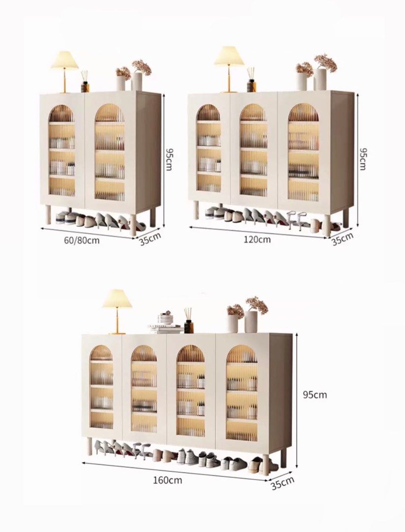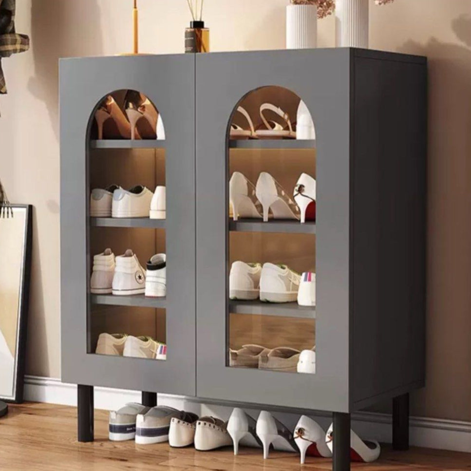 Maintain both organization and style for your shoe collection with our AUGUS shoe cabinet, showcasing transparent arched glass doors that offer a glimpse of your cherished footwear. Enhance the visibility of your collection using the built-in LED light, easily activated by a motion sensor for added convenience. Presented in cream or grey, this cabinet seamlessly fits into a variety of decor styles, be it modern, classic, or hygge-inspired. Declutter your space while utilizing the cabinet's surface to exhibit your preferred frames and accessories.