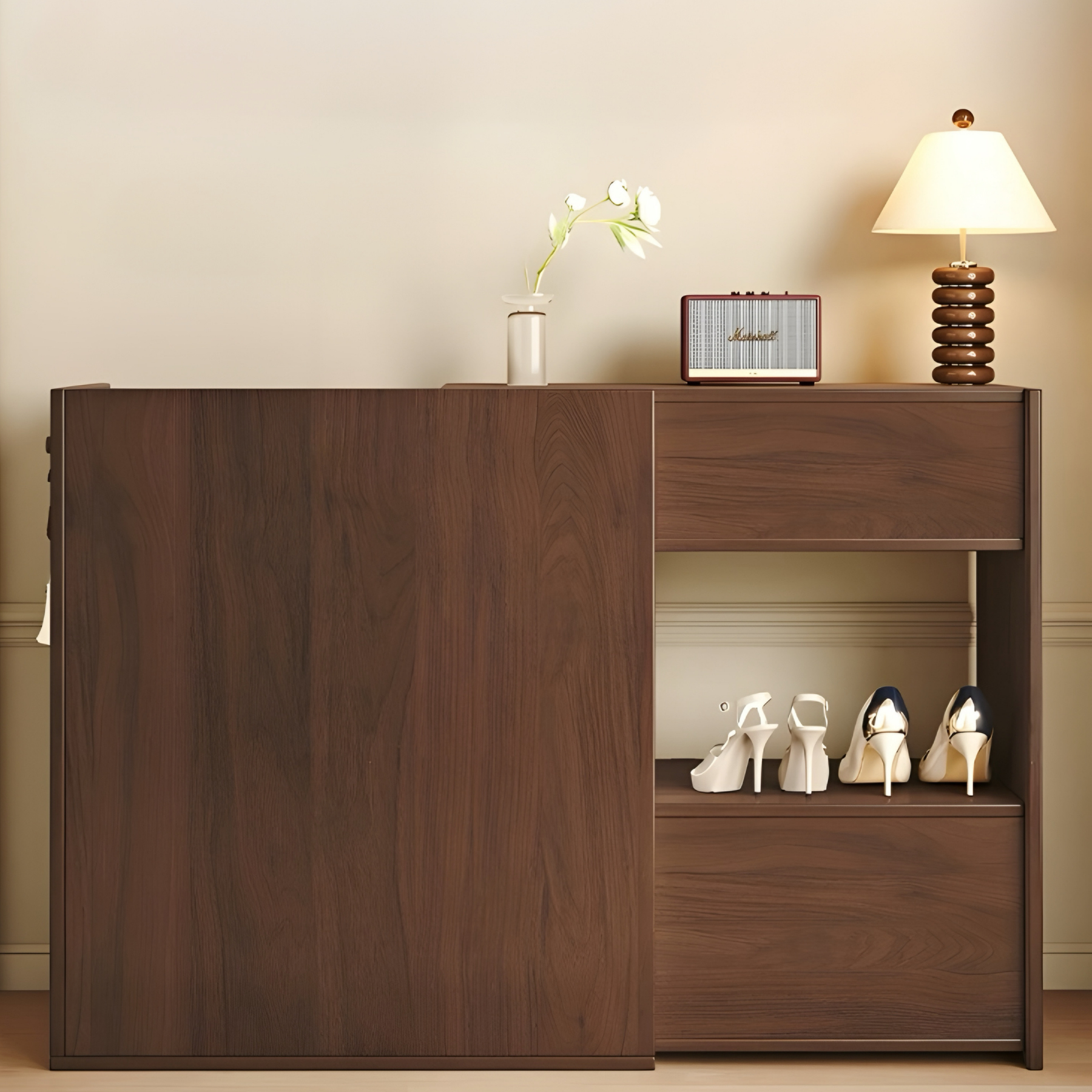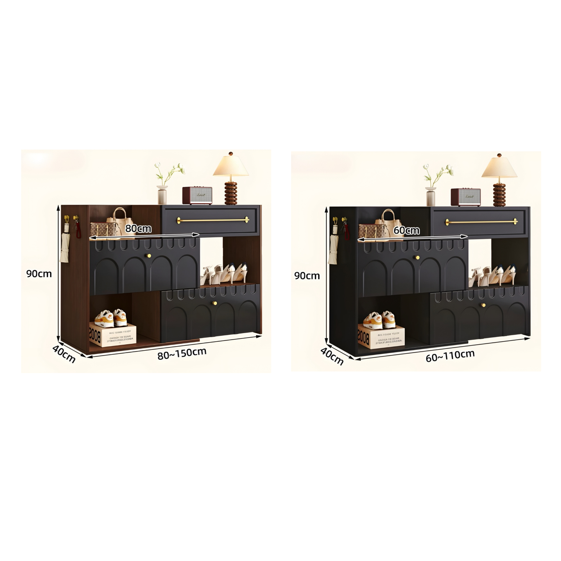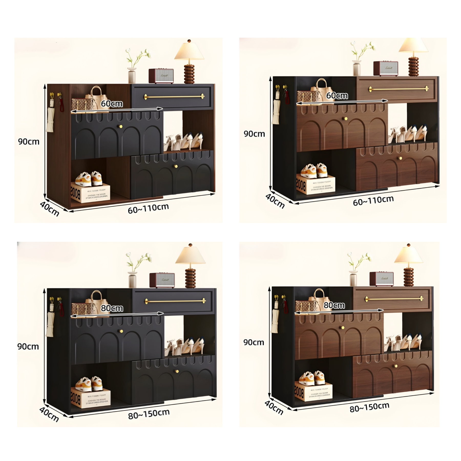 A tidy entryway cabinet combining an enclosed compartment with open display shelves and a wide top ledge. The width adjusts to fit narrow foyers while keeping shoes sorted and clutter-free—ideal for apartments, corridors, studios, and showrooms.