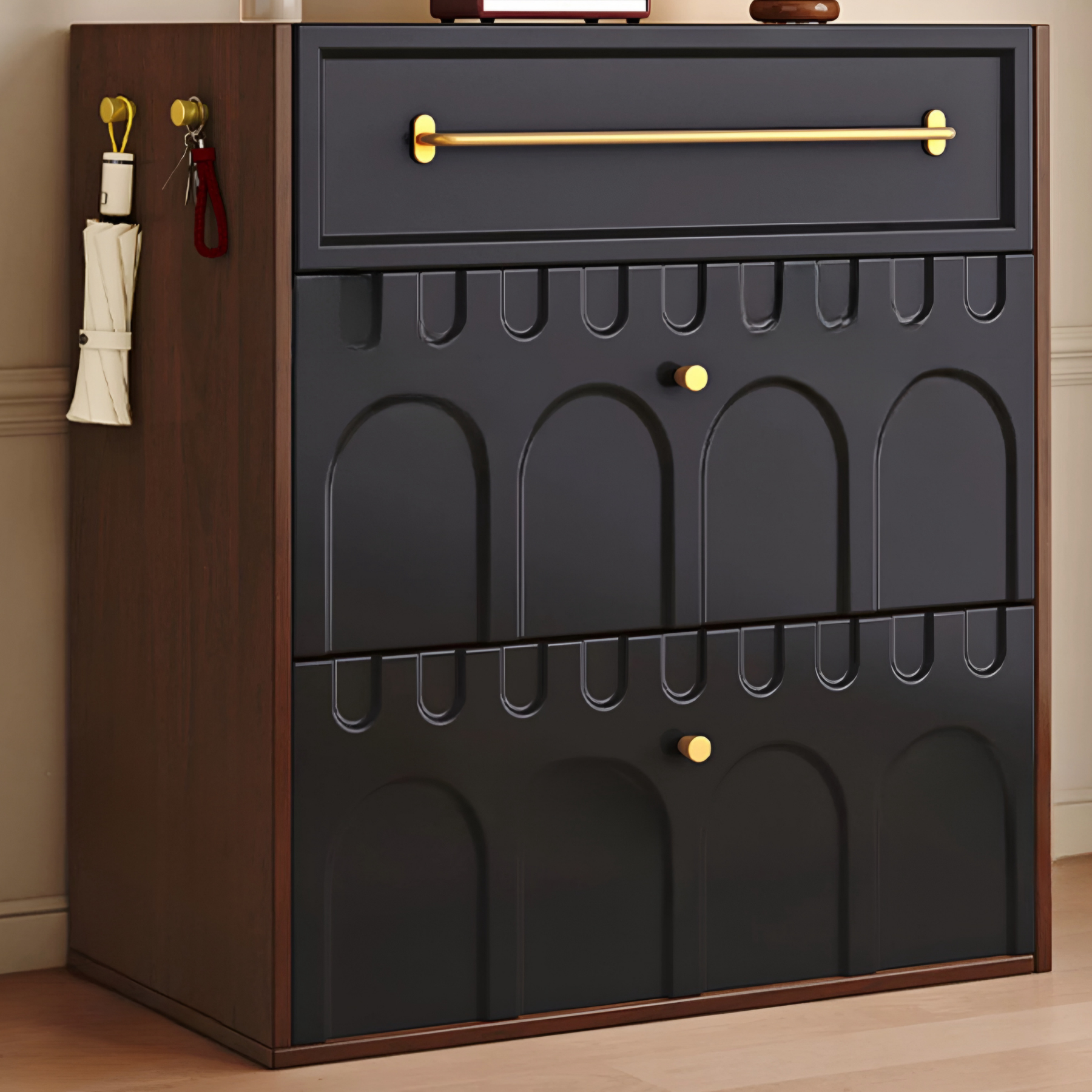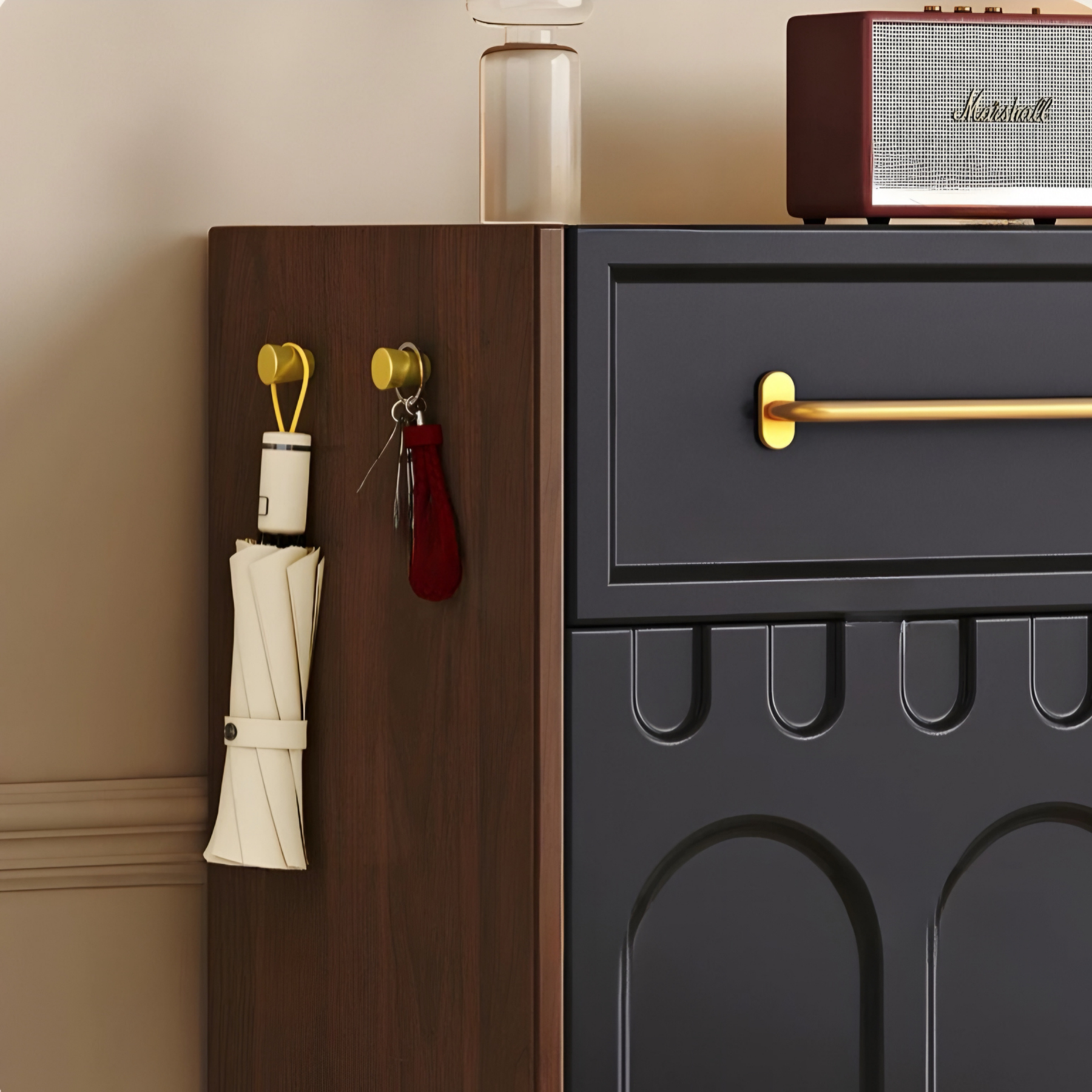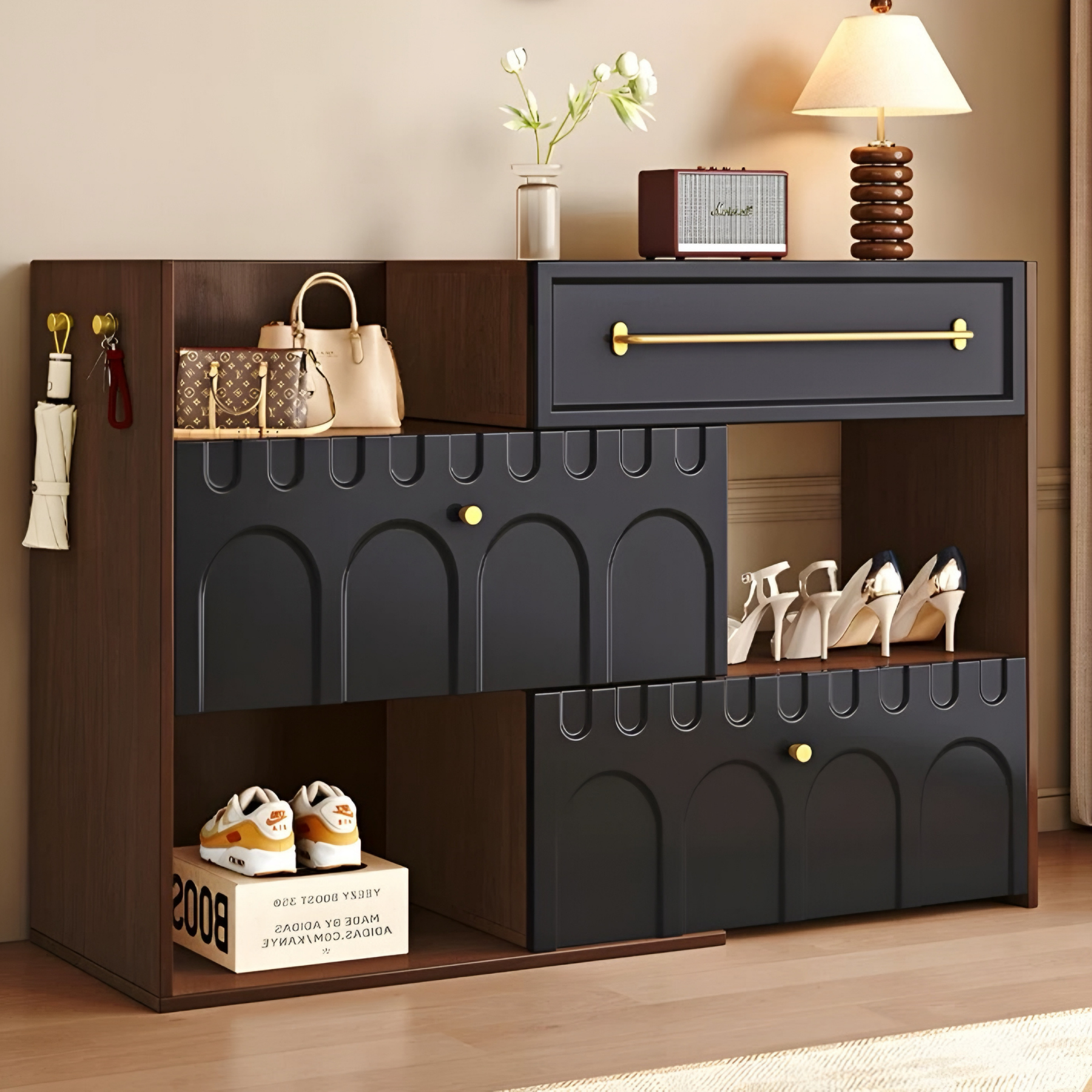 A tidy entryway cabinet combining an enclosed compartment with open display shelves and a wide top ledge. The width adjusts to fit narrow foyers while keeping shoes sorted and clutter-free—ideal for apartments, corridors, studios, and showrooms.