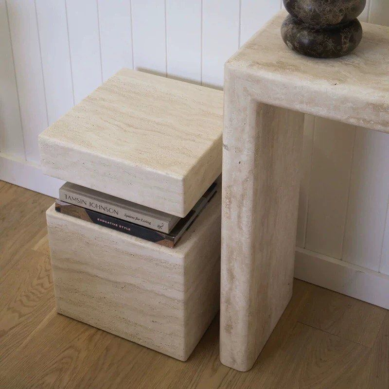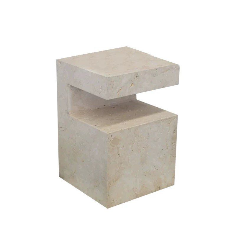 Perfect for placement near a sofa or armchair, it provides ample space for decorative accents or everyday essentials.i Crafted with high-quality travertine, its natural veining and texture add depth and visual interest to your home decor. A perfect choice for those seeking a unique and functional piece that showcases the beauty of natural stone in a cozy and inviting way.