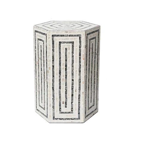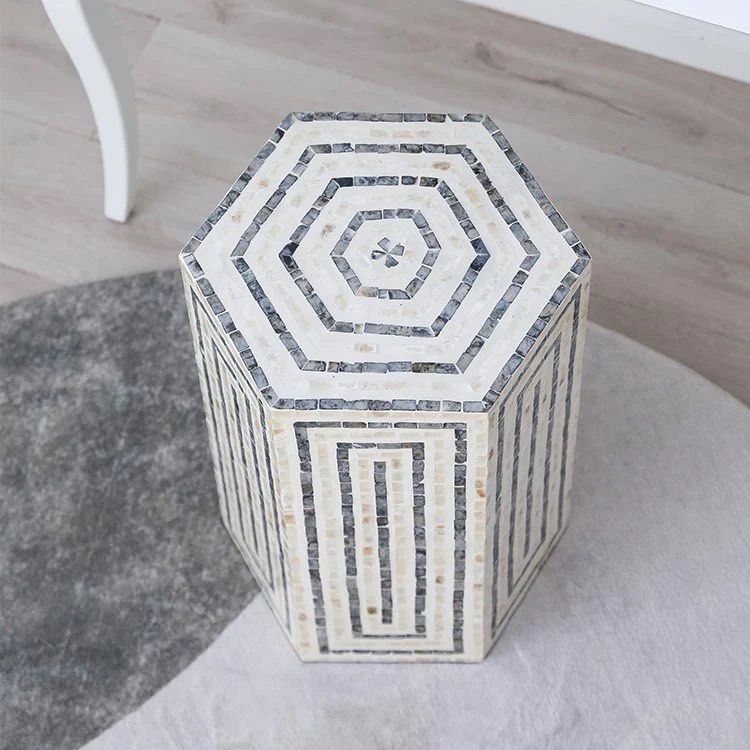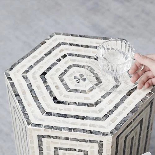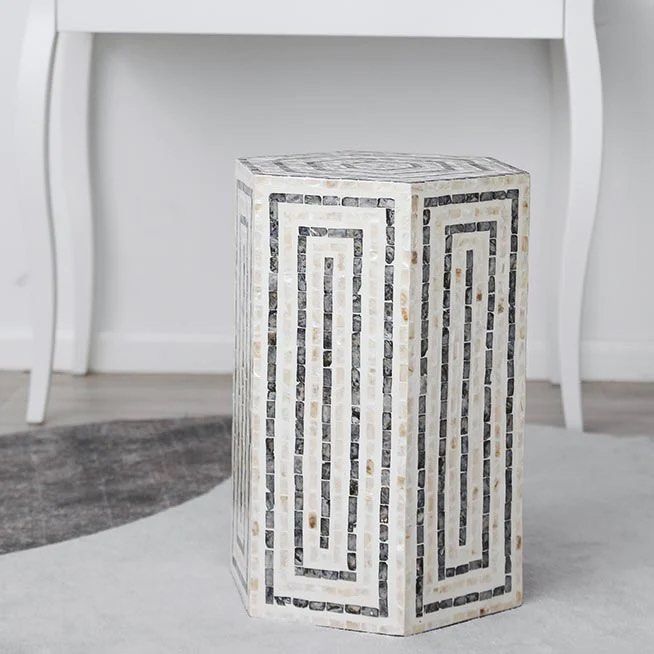 The JACKY Inlay Side Table is a masterpiece of craftsmanship, featuring a MDF structure meticulously overlaid with a radiant mosaic of shell inlay. The intricate design gleams with a natural luminescence, giving the piece a dynamic, ever-changing beauty under different lighting. Its compact form is balanced by the delicate artistry, making it both a practical accent and a conversation starter. Perfect for adding a touch of opulence to contemporary or classic interiors, the JACKY embodies elegance reimagined in functional form.