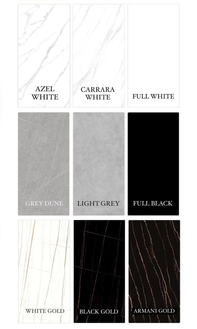Azel white / Carrara white / Full white / Grey dune / Light grey / Full black / White gold / Black gold / Armani gold