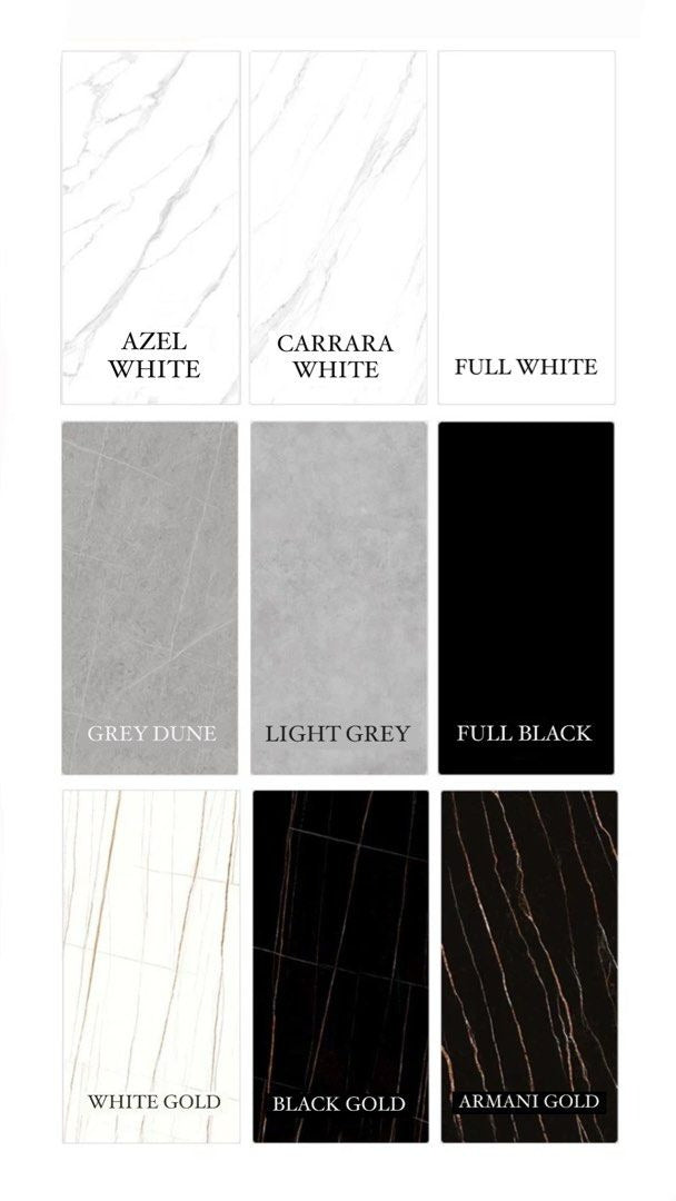 Azel white / Carrara white / Full white / Grey dune / Light grey / Full black / White gold / Black gold / Armani gold