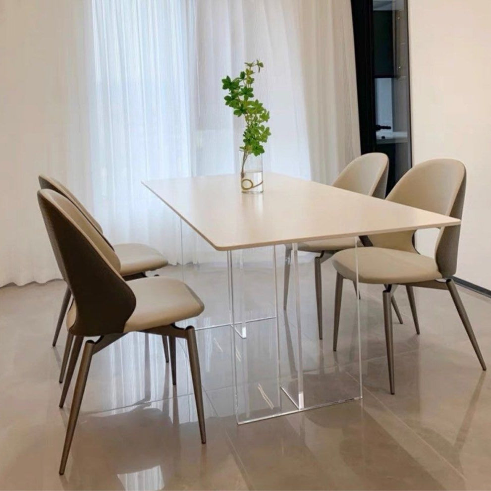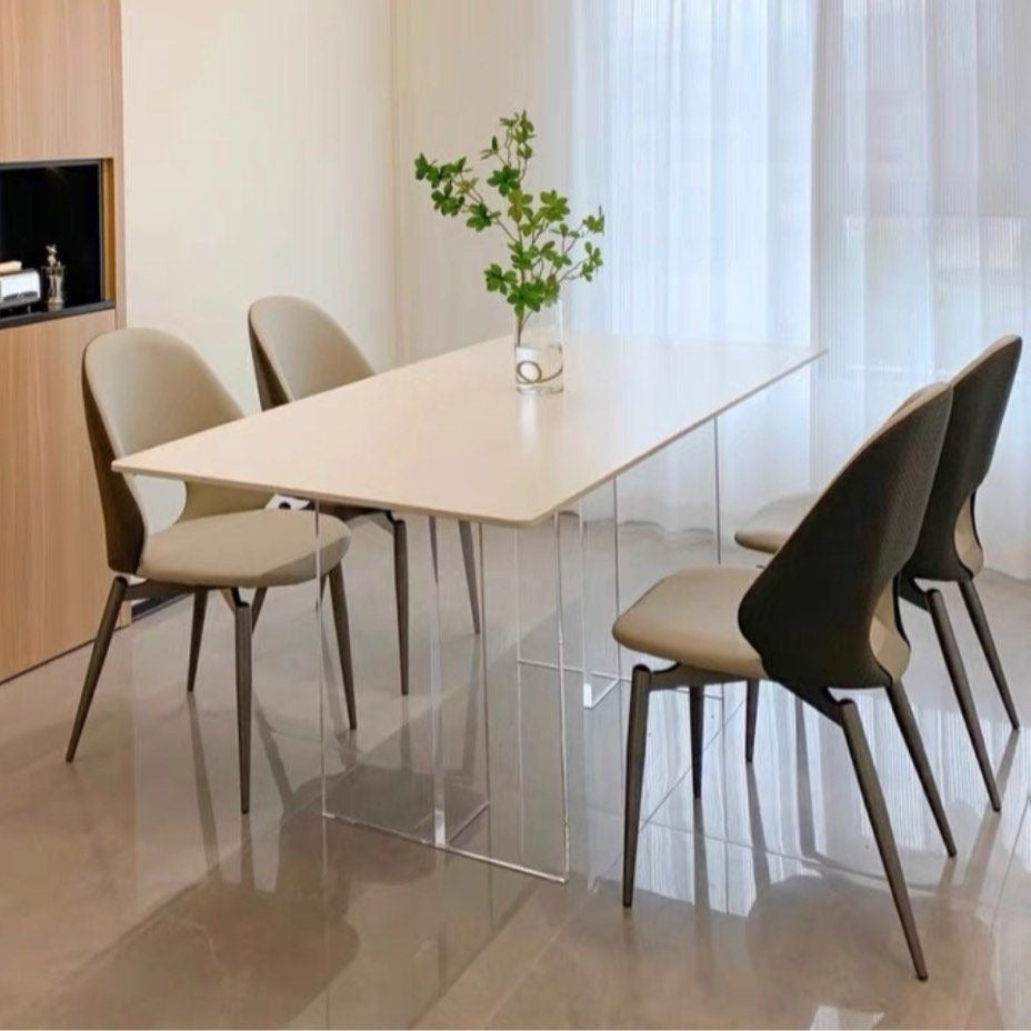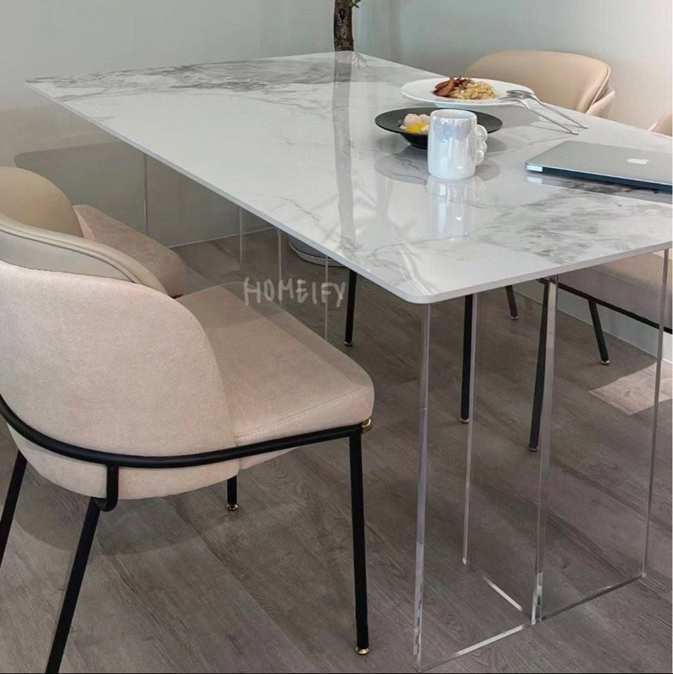 TAVERAS Minimalist Dining Table is a striking and contemporary piece of furniture that combines simplicity with a touch of modern elegance. The standout feature of this table is its legs, which are crafted from transparent acrylic. These legs give the illusion of the tabletop floating in the air, creating a sense of spaciousness and lightness in the dining area. The acrylic legs are designed with clean, straight lines, adding to the table's minimalist appeal.