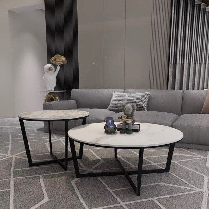 This round coffee table, with its vintage-inspired design, exudes elegance and simplicity that can perfectly blend with any furniture style. Its circular shape guarantees stability, making it a practical addition to any room, whether it be the living room, dining room, or home office. It offers ample space, providing a clutter-free area for entertaining guests or enjoying drinks. The metal frame features a contemporary cross design with clean lines, ensuring a durable base for this charming coffee table.