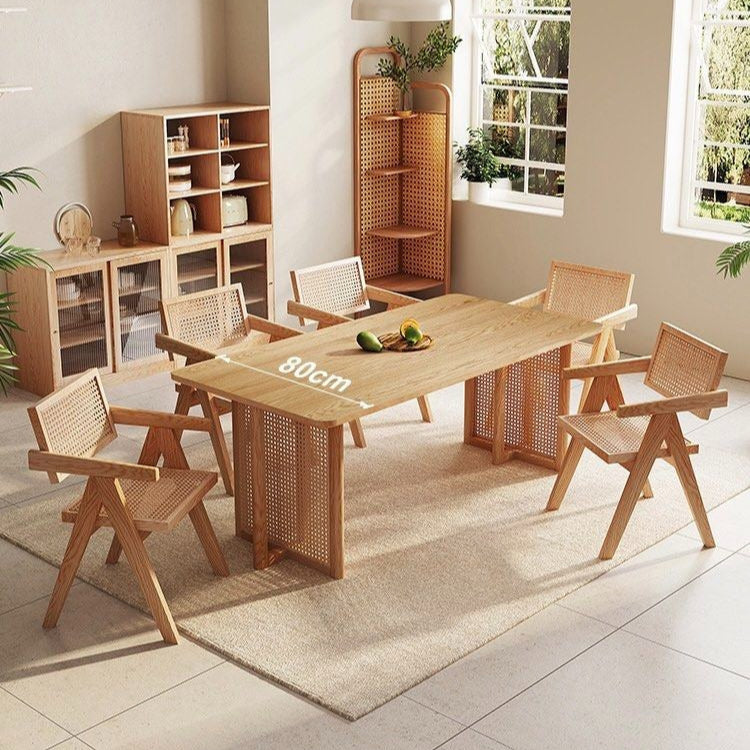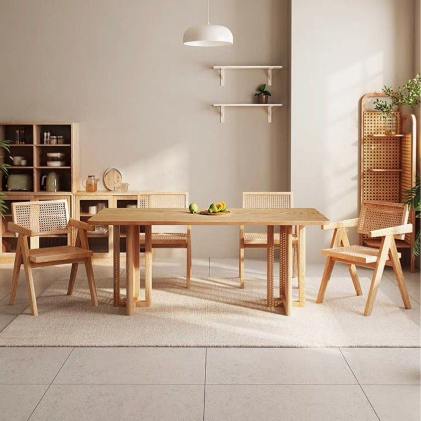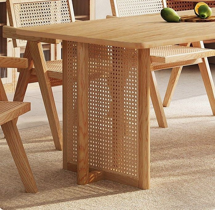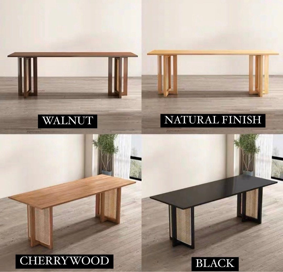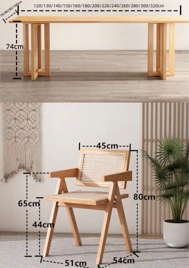 KOVACS Modern Japandi solid Wood & rattan Dining Table is a striking piece of furniture that beautifully blends elements of Japanese and Scandinavian design philosophies, resulting in a harmonious and minimalist aesthetic.