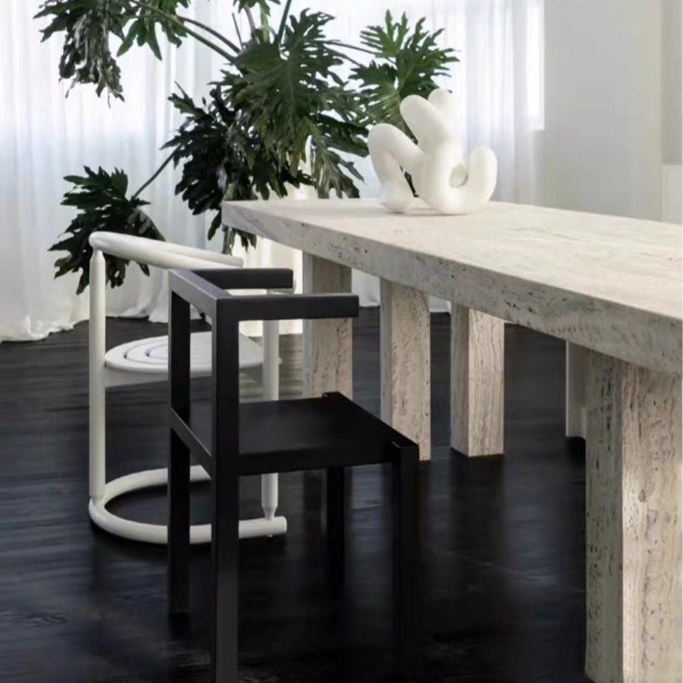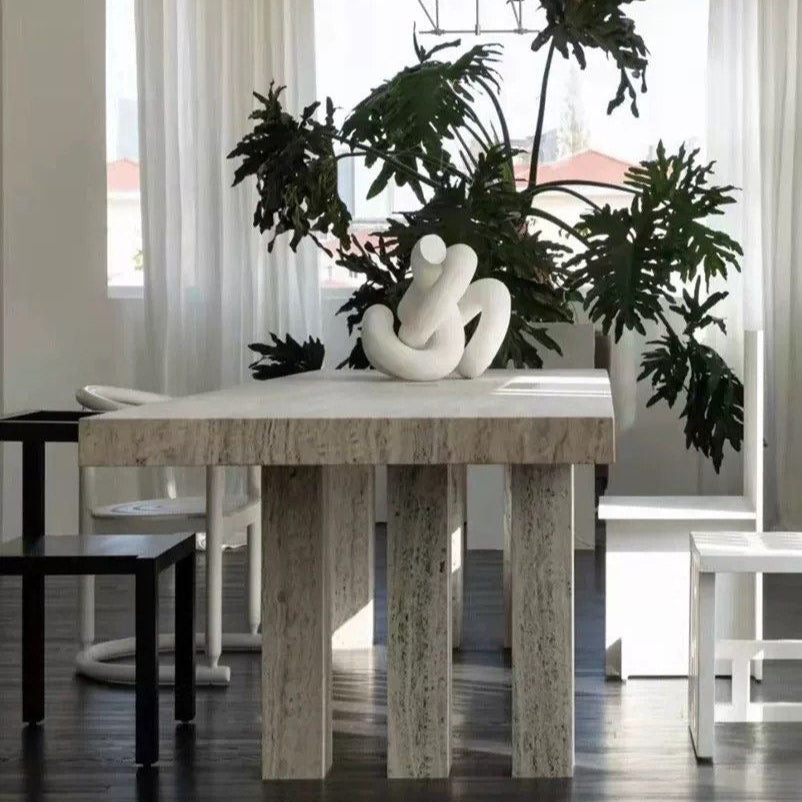 The KENDO Modern Travertine Dining Table exudes timeless elegance with its captivating natural travertine top, showcasing the stone’s distinctive patterns and rich textures. Each table is a unique piece, with the natural striations and subtle variations of color that make travertine a true work of art. The table’s minimalist design highlights the beauty of the stone, making it the focal point of any dining area. The smooth, cool surface contrasts with the organic feel of travertine, creating a sophisticated yet grounded atmosphere. Perfect for those who appreciate the beauty of nature, the KENDO table is a statement of refined simplicity, effortlessly combining function and style.