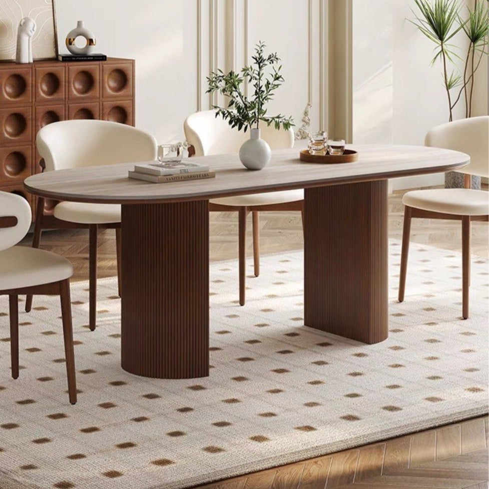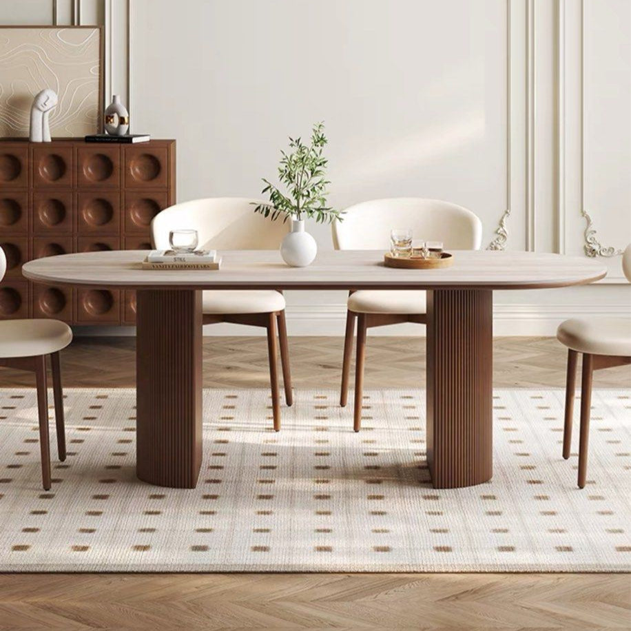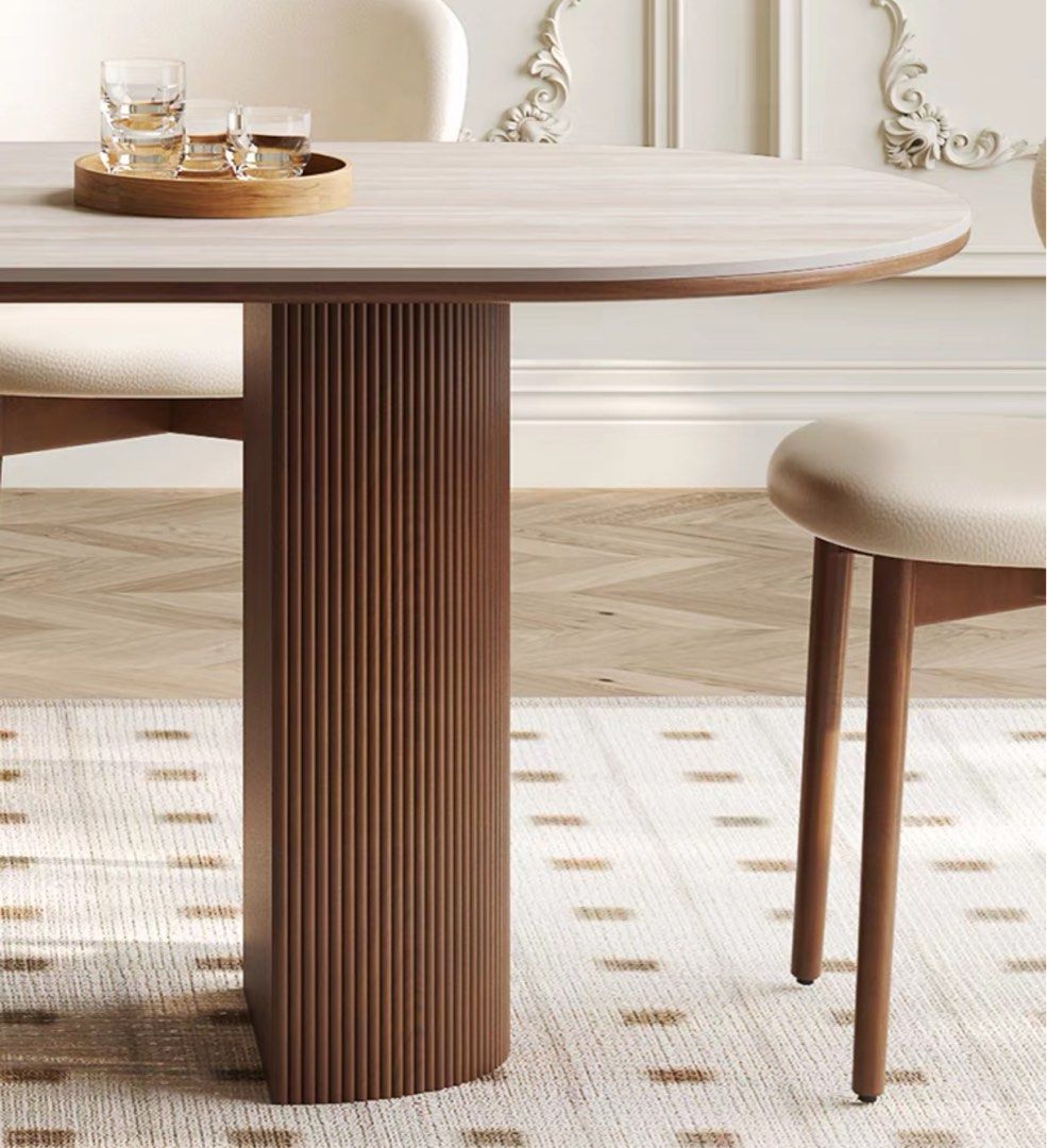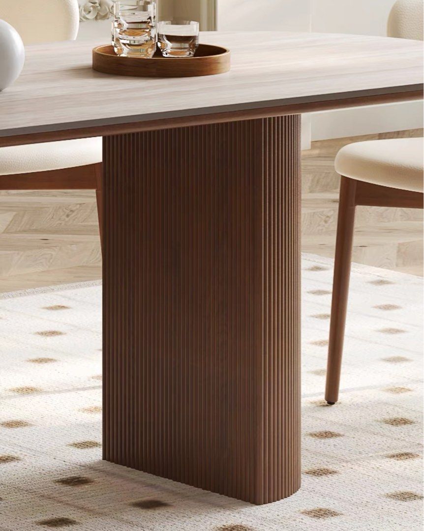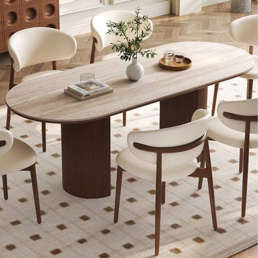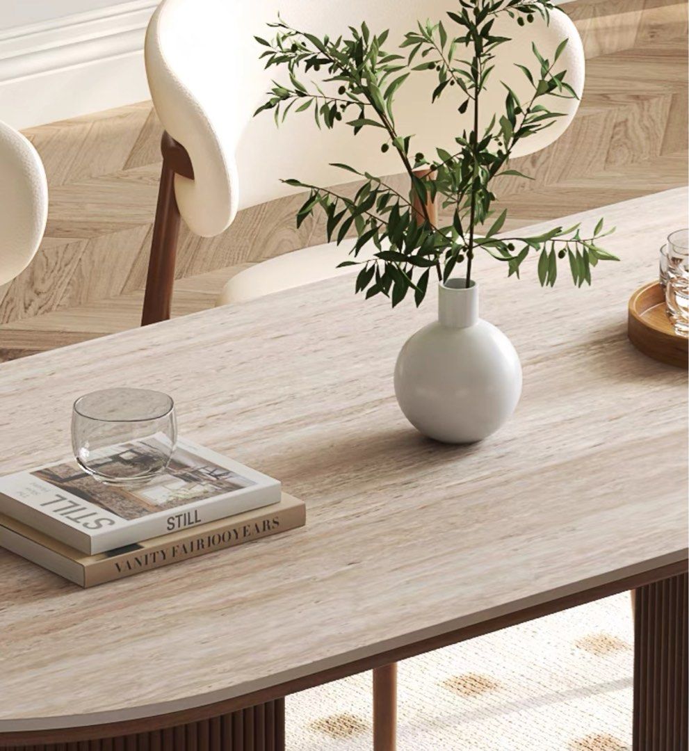 The LORA Modern Travertine Dining Table is a sophisticated fusion of natural elegance and contemporary design, perfect for creating an inviting atmosphere in any dining room. The table is crafted with a luxurious travertine stone top, known for its distinctive veining and rich, earthy tones that evoke timeless beauty. The smooth, honed finish of the stone not only highlights its natural patterns but also offers durability and easy maintenance, making it an ideal choice for both everyday meals and special occasions.