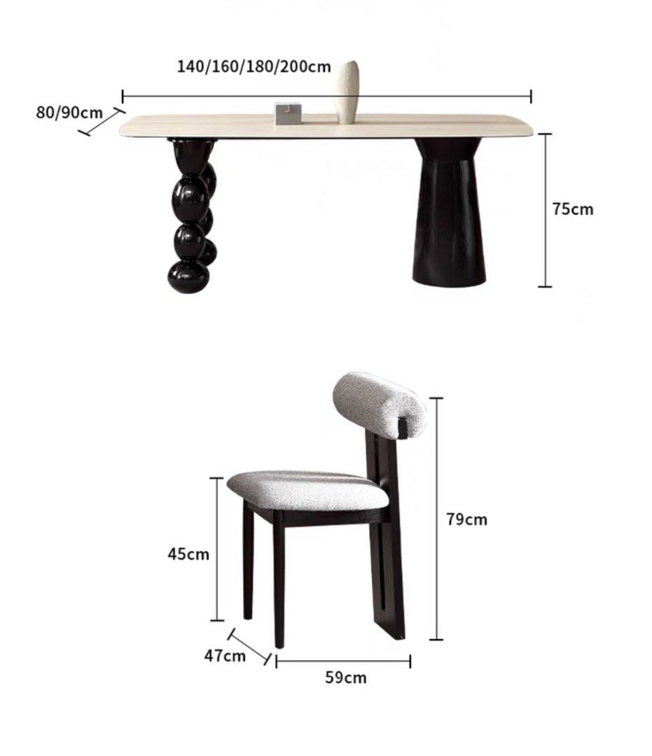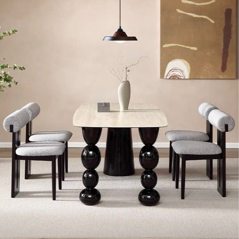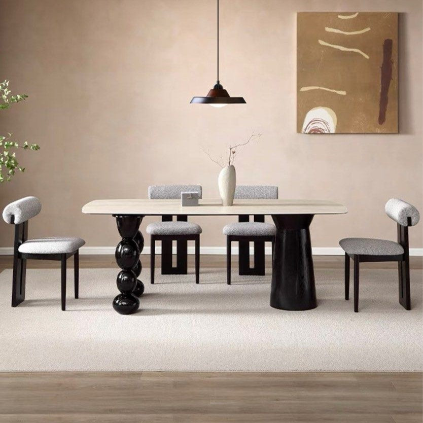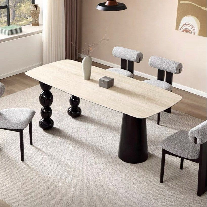 "PERES modern travertine dining table features a sleek and contemporary design. It’s crafted from travertine stone, which gives it a natural, textured appearance. The tabletop is