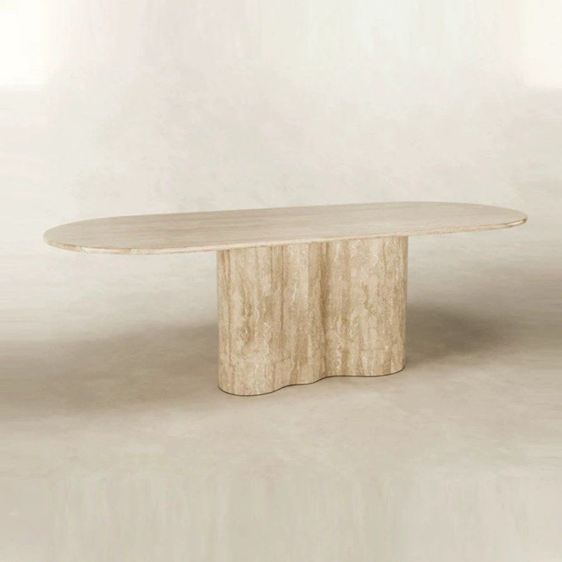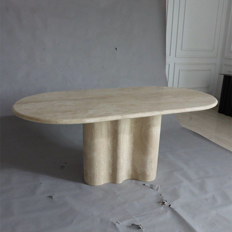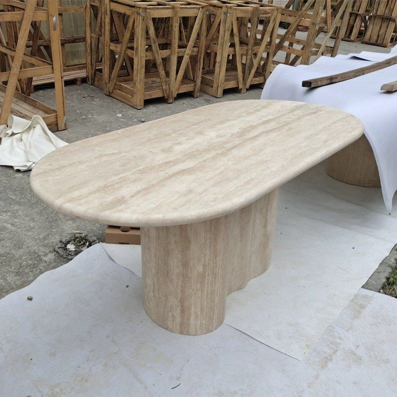 The ROMAN Modern Travertine Dining Table is a stylish and contemporary piece that combines natural stone with modern design. It features a solid travertine top, which is known for its durability and unique natural patterns, lending an organic and sophisticated touch to any dining space.