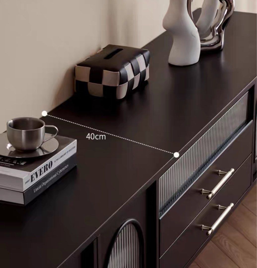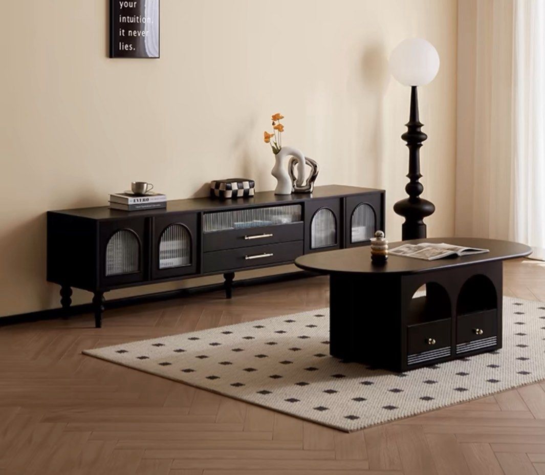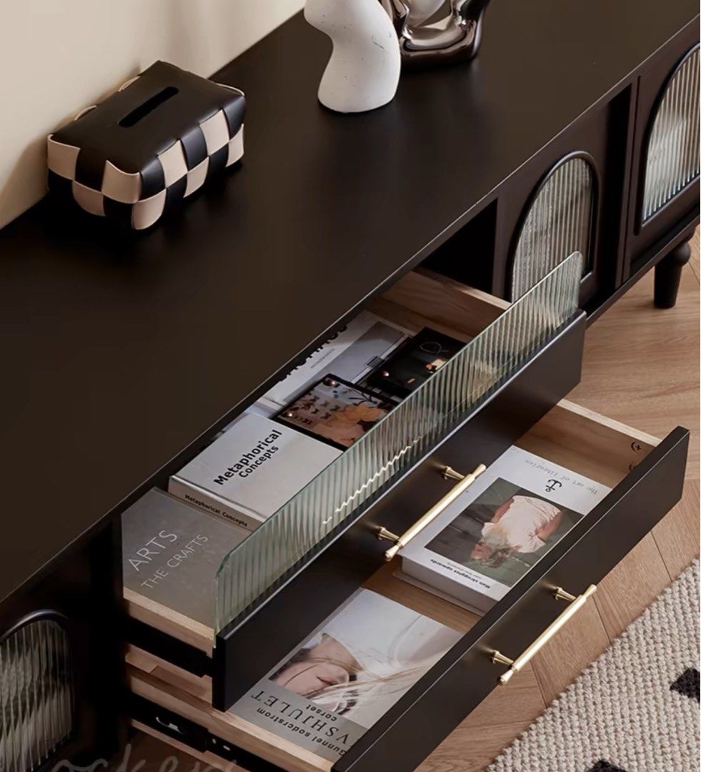 Transform your living area with our CALVE modern TV cabinet. This chic furniture item incorporates mid-century design elements with a touch of contemporary sophistication. Its adaptable style effortlessly harmonizes with diverse interior decors, making it a perfect enhancement for any space. With a combination of open shelves, drawers, and cabinet doors, this TV stand offers generous storage space, elevating your home with practicality and style.