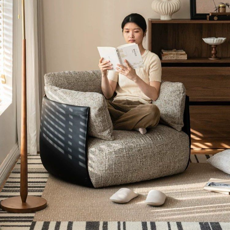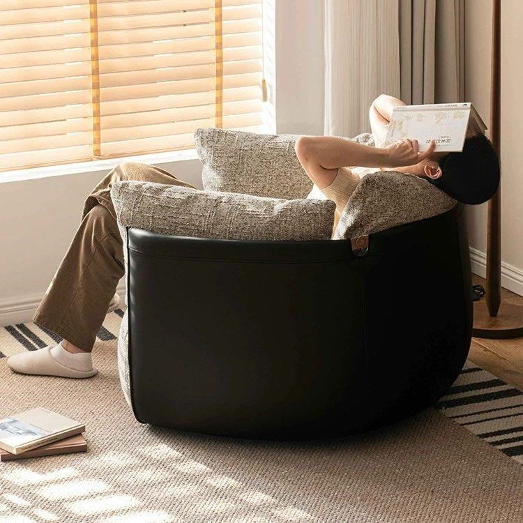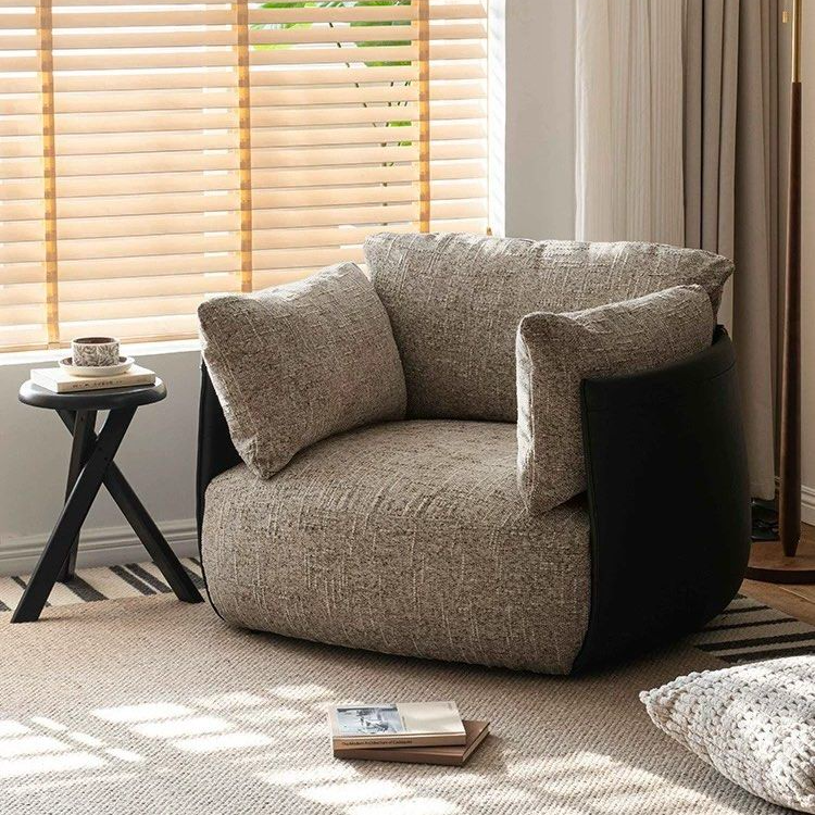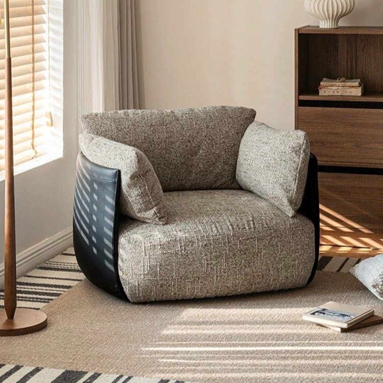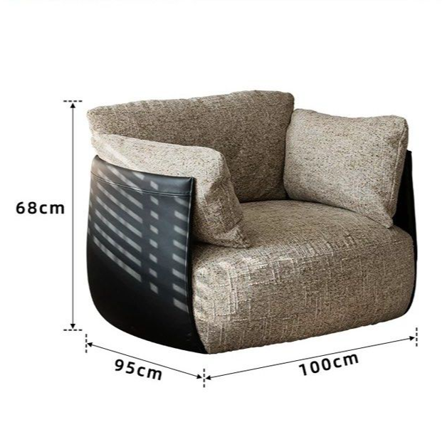 The KIERE Modern Lounge Chair is a stylish and contemporary piece of furniture designed for both comfort and aesthetic appeal. It features a sleek, minimalist silhouette with clean lines, incorporating a mix of materials such as Nappa leather & cotton linen fabric for a sleek sophisticated look.