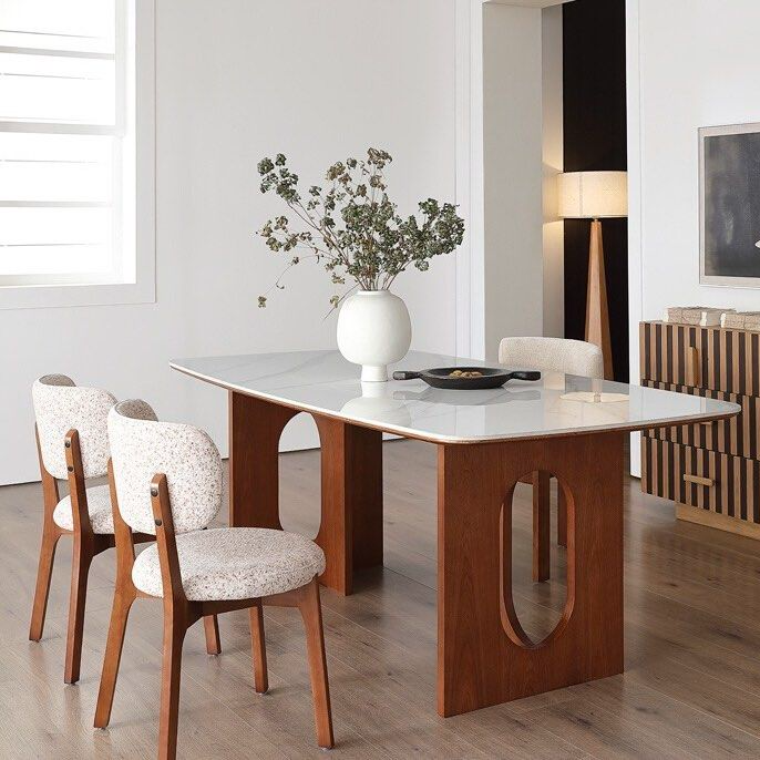 Introducing our THEMIEN dining table, featuring a durable sintered stone top with the elegant look of travertine. Made to last, this table adds a touch of sophistication to any dining room. Experience the beauty of natural stone without the maintenance.