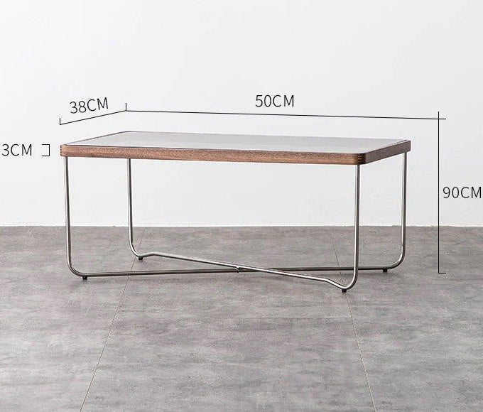 Black walnut wood table top frame, tempered glass table top, stainless steel legs